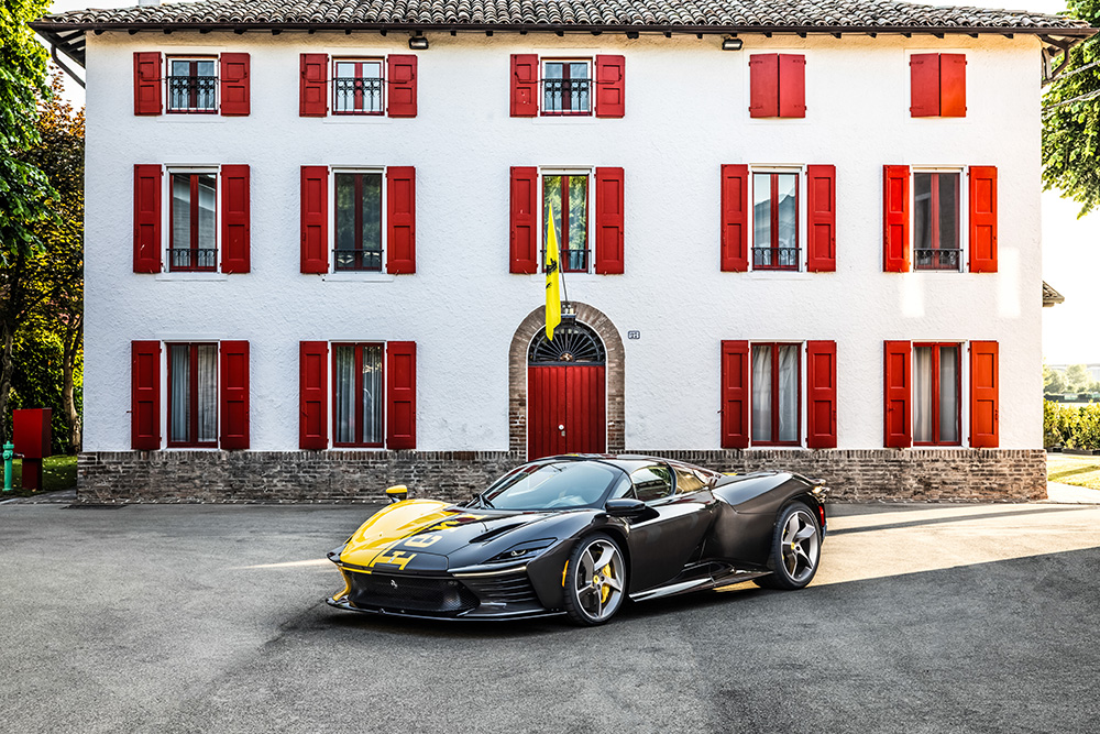The car featured a two-tone exposed carbonfibre and Giallo Modena finish, contrasted by gloss-black carbon-composite elements on the front splitter, side skirts and rear diffuser. A full-length Ferrari logotype livery ran from nose to tail – a first for a Ferrari road car. It was equipped with 20-inch front and 21-inch rear forged diamond-finish wheels, complemented by Giallo Modena brake calipers.