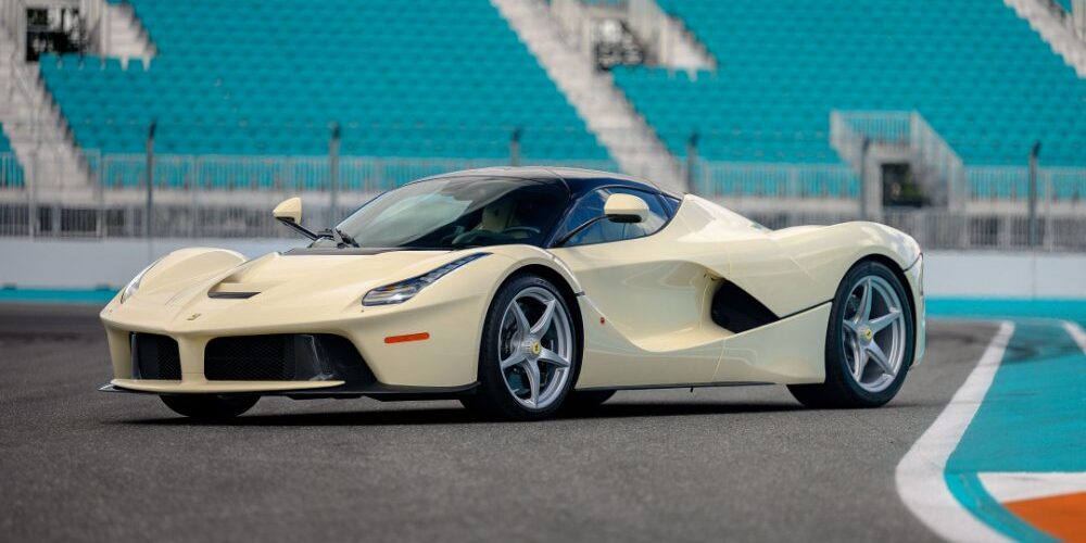 The Bonhams Miami 2026 sale is led by the 2015 Ferrari LaFerrari pictured above, estimated at $7.5m to $9.5m. The car was originally specified for Van Halen’s Sammy Hagar and is finished in Bianco Avorio, a unique shade referencing a 1964 Ferrari prototype. Hagar sold the car in 2024, and in total it has covered 1500 miles. It features a plaque bearing its original owner’s initials and birthdate.