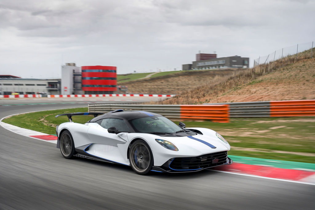 Starting out on track (albeit a damp one), its rapacious appetite for revs and gears – and the soaring numbers on the digital speed readout before me – articulate how outrageously fast it is. Yet the Aston Martin engineers have pulled the absurd trick of making such pace feel within your grasp, of allowing your brain to keep up. I canter through the drive modes, loosening some of the stability control’s grasp, but it remains trustworthy in corners.
