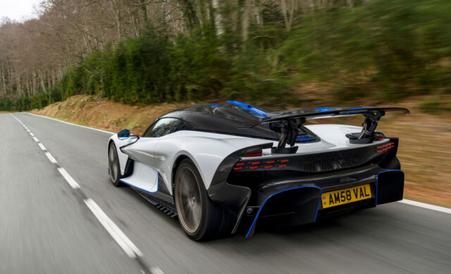 Starting out on track (albeit a damp one), its rapacious appetite for revs and gears – and the soaring numbers on the digital speed readout before me – articulate how outrageously fast it is. Yet the Aston Martin engineers have pulled the absurd trick of making such pace feel within your grasp, of allowing your brain to keep up. I canter through the drive modes, loosening some of the stability control’s grasp, but it remains trustworthy in corners.