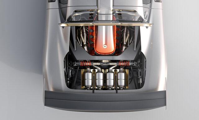 The shape is set up for low drag, with the front splitter, side skirts and twin-channel rear diffuser generating ground effects without a need for the fan seen on the T.50 and T.50s. Instead it has a deep, full-width rear wing to glue the car the ground.