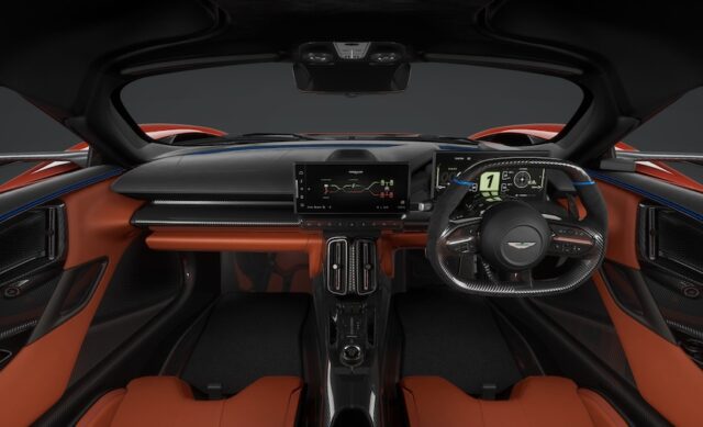 Inside, I go for California Poppy as the main colour, with a blue contrasting stitching and a matching blue line around the cockpit and on the steering wheel. It shouldn’t work but I love the effect.