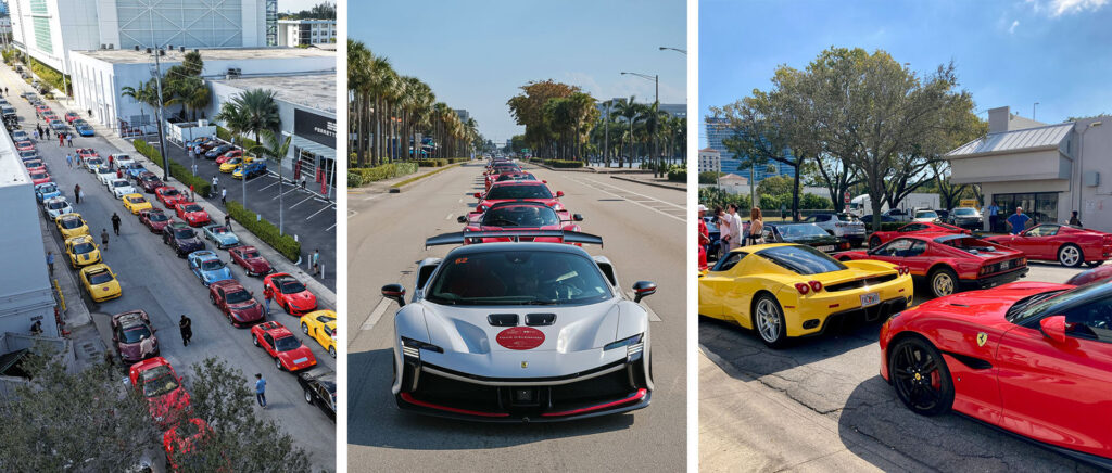Activities kicked off with Friday’s Tour d’Eleganza. Almost 80 Ferraris, the majority being post-1990 model year, lined the closed-off street outside luxury yacht dealer Ferretti Group America’s Fort Lauderdale dealership for a pre-tour lunch and a shoes-off wander around one of event partner Riva’s 88ft sportfly Folgore wonders.