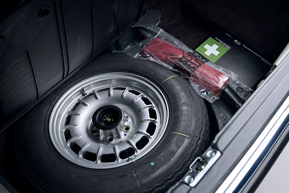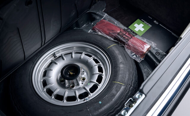 The car still features its original stickers, plus dealer-provided Waxoyl on the engine and exhaust; there’s no corrosion at all. It was fitted with optional extras worth £2331 (£8360 today) including air-conditioning, heated seats, ABS, leather, rear seats and metallic paint, and it still has its sales documents from Carols of Wolverhampton. The tyre mark where the car was stood for all those years can be seen above.